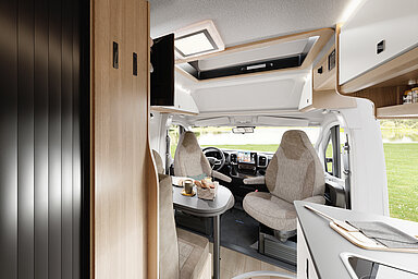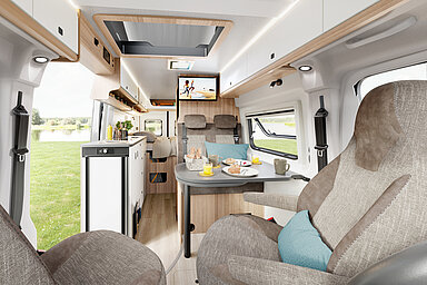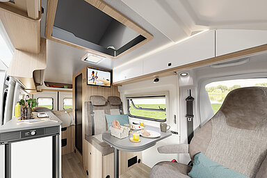 Mit der Weiterentwicklung der ONTOUR-Modellreihe haben nun auch Familien und Camper mit erhöhtem Stauraumbedarf volle Gestaltungsfreiheit. Durch die zwei Schlafplätze im Aufstelldach und das bereits vorhandene französische Bett im Heck stehen nun insgesamt vier Schlafplätze zur Verfügung. Aufgrund des separaten Sitzbereichs im vorderen Teil des Fahrzeugs ist der Familienalltag ohne vorherigen Bettumbau möglich.